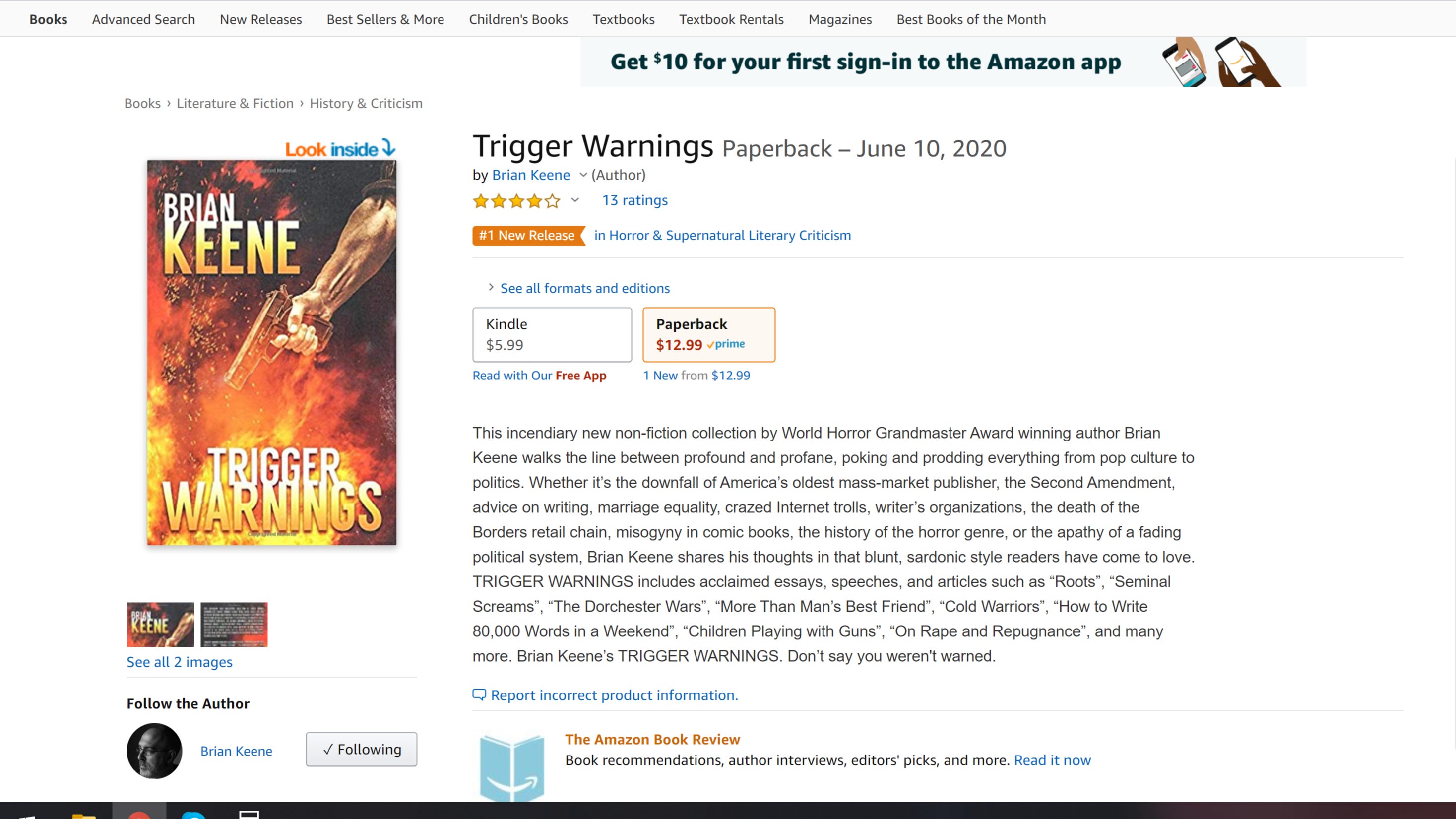Thanks to everyone who bought a copy of TRIGGER WARNINGS last week. You put it at number one on Amazon's best-seller chart (in the Horror & Supernatural Literary Criticism chart). I really appreciate it.
