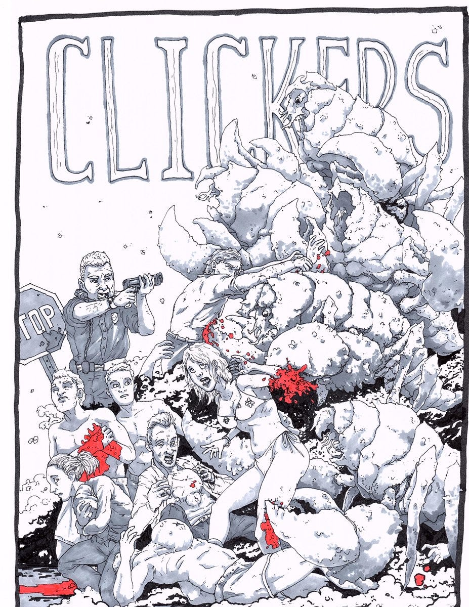 But yes, there are Clickers stories, too. Adam Cesare -- one of the most popular and promising names to emerge out of this coming-to-prominence next generation of horror writers -- wrote one. Earlier this week, he told his friend, artist Chris Enterline, about it, and Chris got so excited he drew the following fan art.