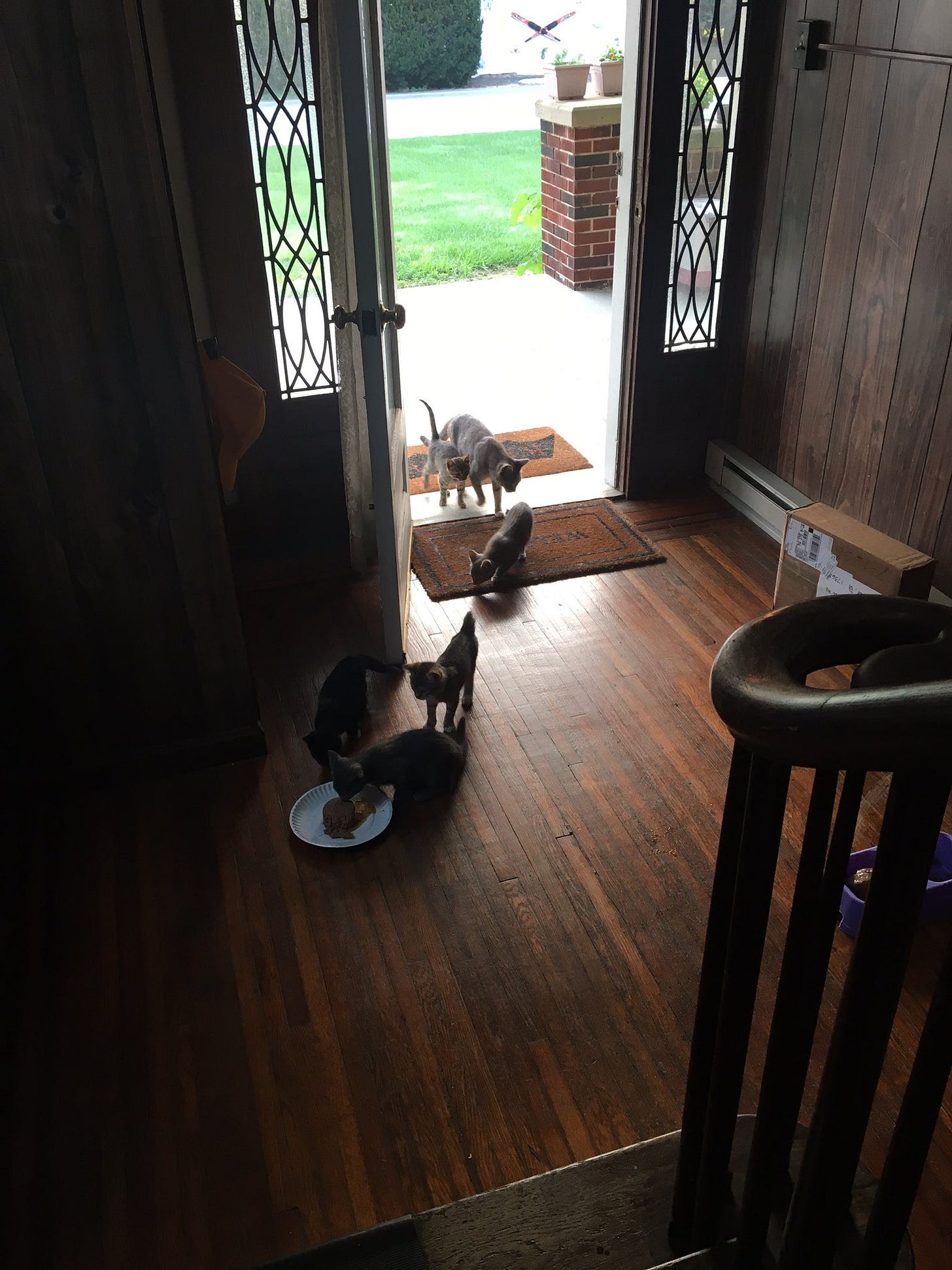 So, on Monday, I shut the door leading into the downstairs area, and I opened the door to the stairwell. Then I put their food at the bottom of the stairs. Josey tested it first, and then the kittens followed her inside. My plan was to close the door behind them and effectively give them run of the second floor until I could find homes for them all. That way, they’d be safe and easy to catch. Everything was going well until I stood up to close the door — at which point all of the kittens except Stripe ran back outside.