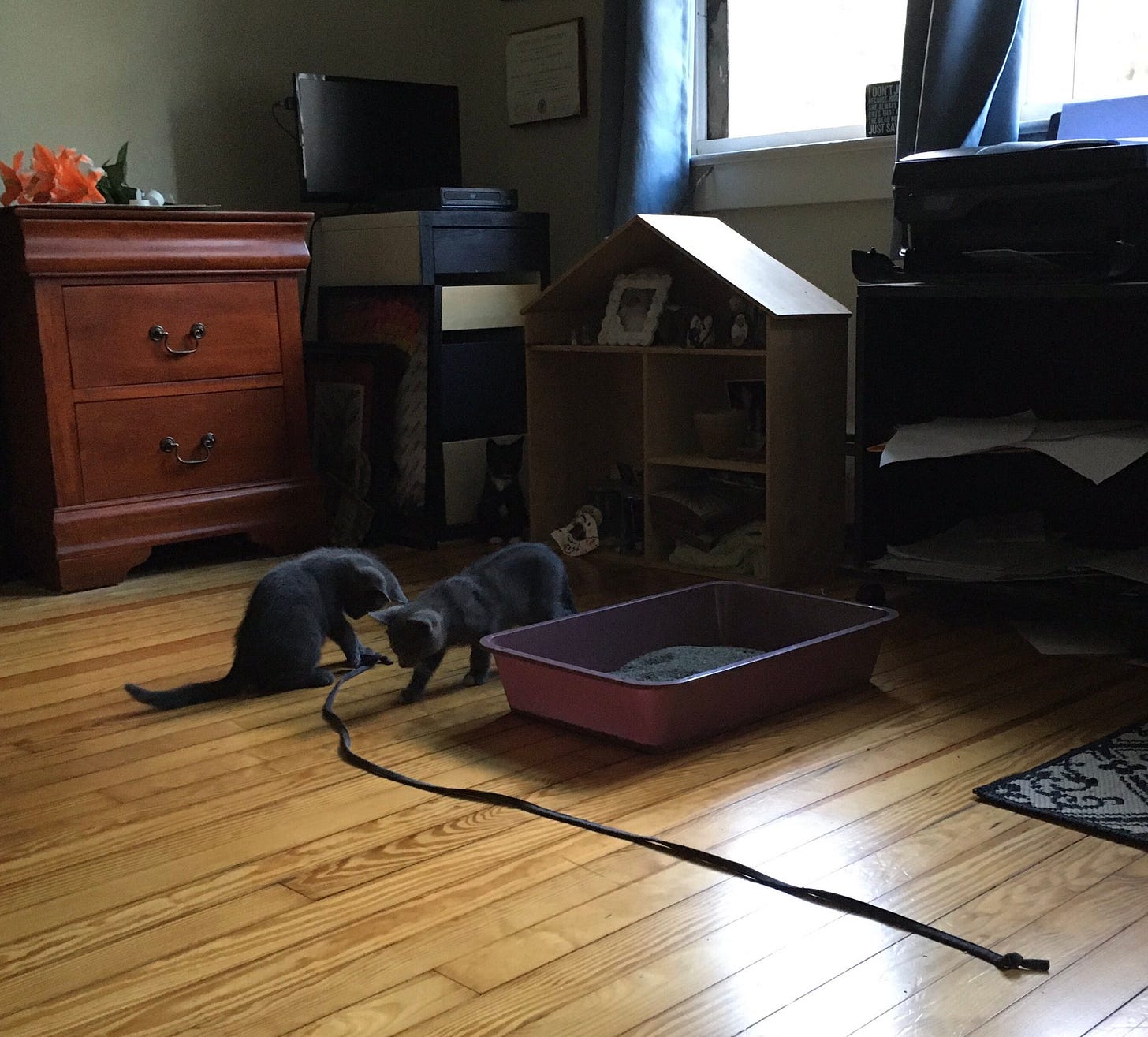 On Wednesday, all of the kittens and Josey were inside, except for Stripe. I crept around the far side of the house, intent on shutting the door behind them, when suddenly, Stripe brought me a very long blade of grass that he’d killed for me, and dropped it at my feet on the porch right outside the door. he then proceeded to play with it, at which point the other kittens ran outside and played with it, too.