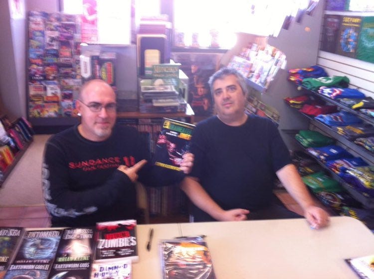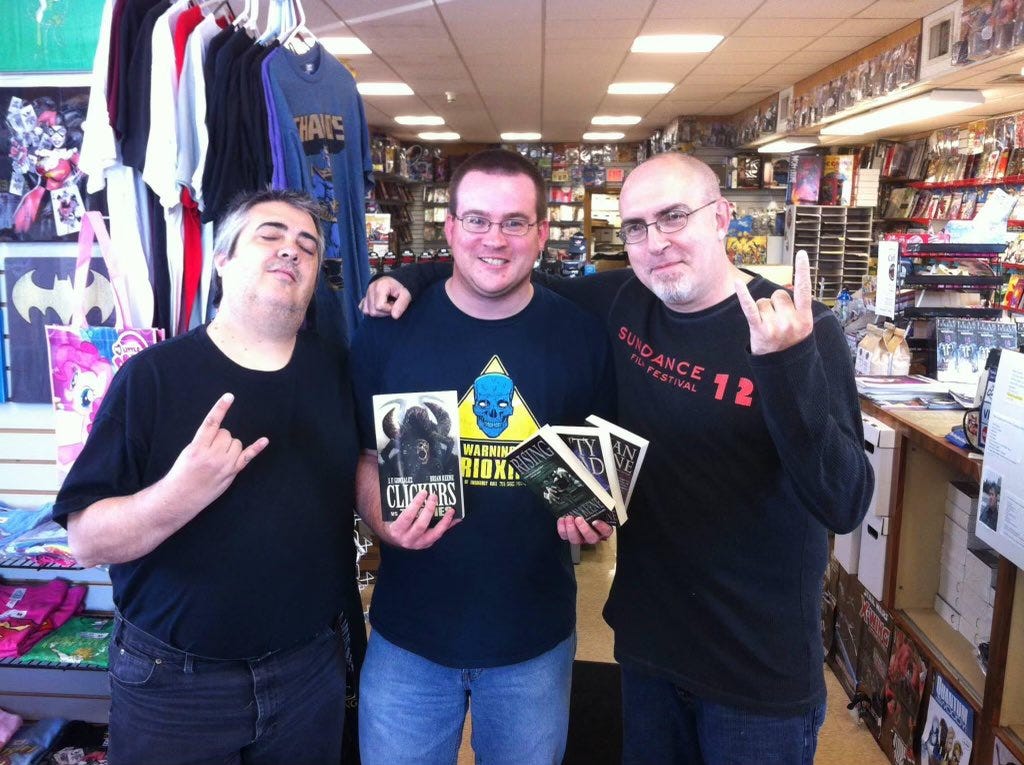 A few days ago, Kozeniewski shared two pictures with me that I don’t think I’d ever seen before. They were taken eight years ago, at a signing J.F. Gonzalez and I were doing at The Comic Store in Lancaster, PA. It was the first time Stephen had met either of us, and he was very nervous. He had a copy of his first published novel with him. Now, here we are eight years later, and J.F. has completed his Circle of Life (and possibly started a new one) and Stephen, along with author Wile E. Young, are guiding the Clickers franchise for a ne generation of readers. I like that synchronicity.