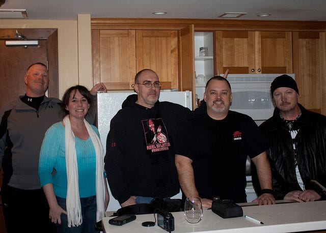 Top row, L to R: Mike Oliveri, Tod Clark, Michael T. Huyck Jr. Bottom row: Mary and myself. Photo by either Suzin Clark or Mark Sylva (I can’t remember which).