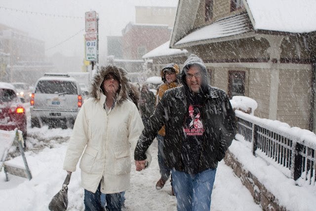 My dear friend and long-time pre-reader Tod Clark reminded me this past week that it has been ten years this month since we spent a weekend at the Sundance Film Festival and simultaneous Slamdance Film Festival for the premiere of GHOUL — the movie adaptation of my novel. Here’s a picture of Mary and myself from that weekend, hiking through the snow to find some sushi.