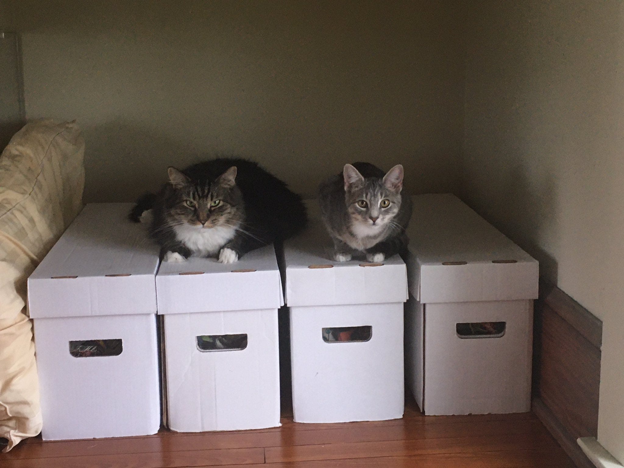 This week’s cat pic, because if I don’t include one, many of you will yell at me. Here are Stripe (age nine) and Bubbles (age 6 months) guarding a portion of my comic book collection. The pillow on the side is something I laid across the boxes for them. They did not care for it, apparently.
