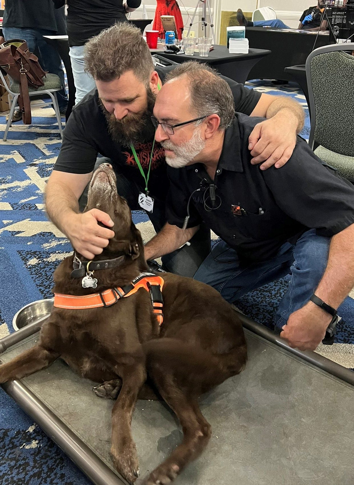 But Bear was where I let my guard down. She was happy to see her Uncle Brian, of course. From the moment she saw me as she walked into the Doubletree By Hilton, accompanied by Kristopher Triana and Mona Kabbani, that tail started wagging exuberantly. And I took that mask and my secret service-styled earpiece off so she could give me big sloppy dog kisses.