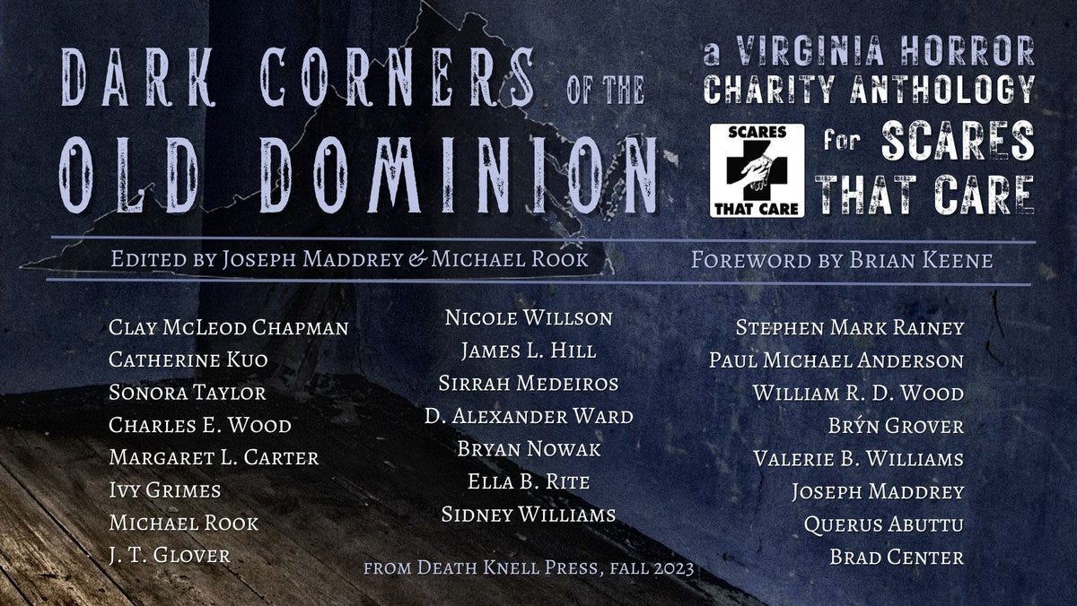 Speaking of Scares That Care, I’d like to thank Red Lagoe and Death Knell Press for putting together an anthology to benefit the charity. It’s called Dark Corners of the Old Dominion and you can learn more about it here.