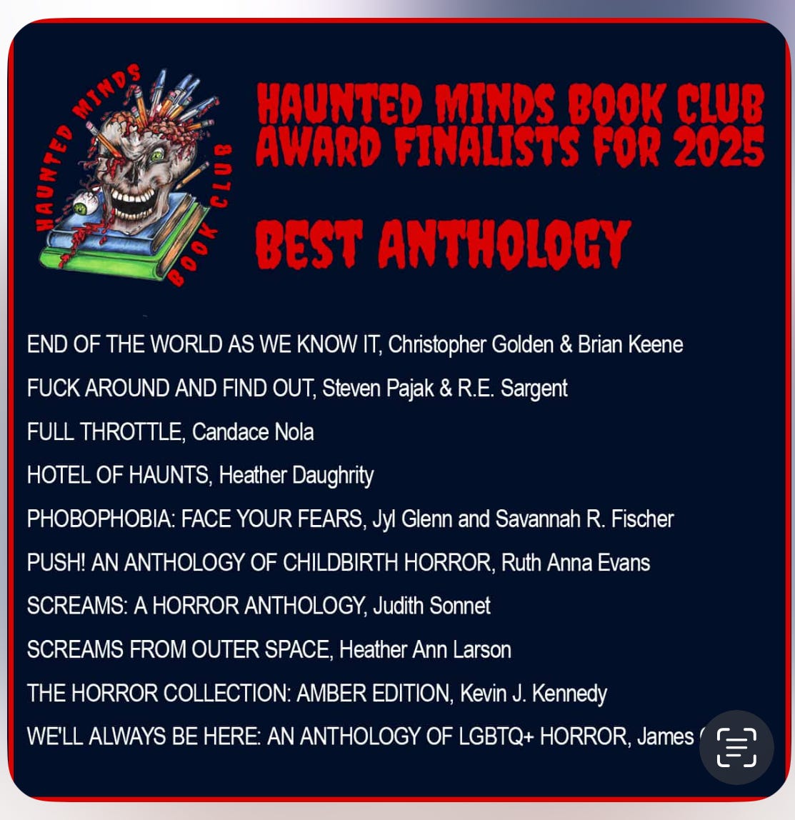 I was very honored to learn that THE END OF THE WORLD AS WE KNOW IT: NEW TLES OF STEPHEN KING’S THE STAND won a Haunted Minds Book Club Award for Best Anthology! Thanks to all the voters and the jury. Definitely a heavy hitting slate of finalists there. Very proud to be among them.