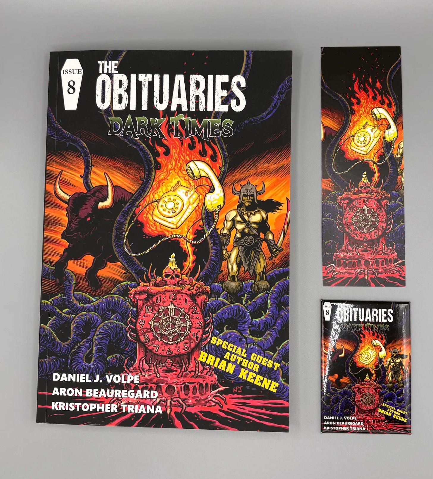 This paperback book contains all new stories by me, Kristopher Triana, Aron Beauregard, and Daniel J. Volpe, with cover art and interior illustrations by Nick Justus. It also features 4 all-new faux obituaries, including one I wrote about himself!